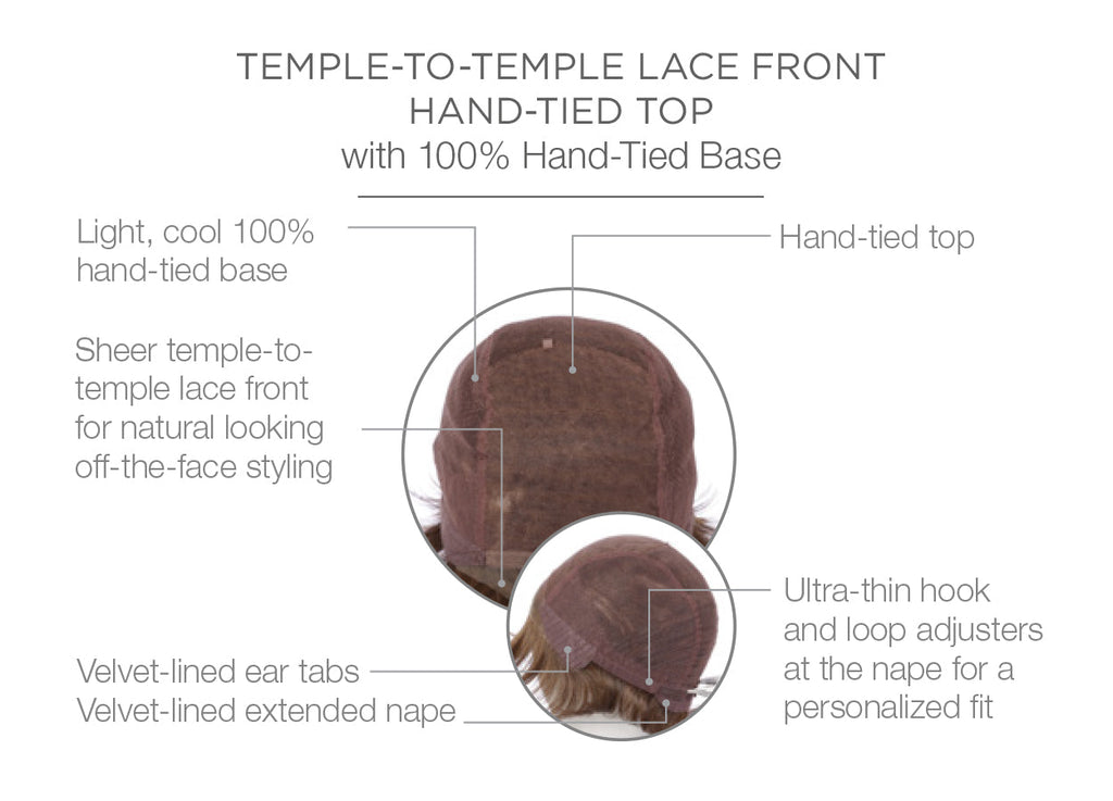• base design: 100% Hand-tied Cap – each individual hair is carefully hand tied to the base. This creates natural movement and allows the hair to move freely. The soft stretch cap makes it more comfortable to wear and is ideal for a sensitive scalp.