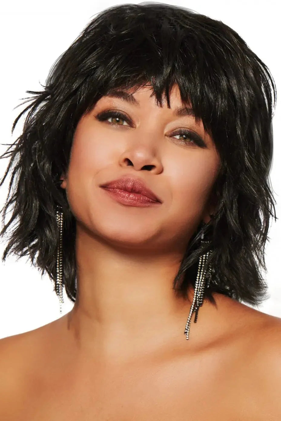 Introducing the Heat Friendly New Wave Wig by TressAllure - a stunning mid-length layered bob featuring feathered bangs, a sleek silky top, and textured layers that fall below the collar. This bob perfectly combines various textures and contoured layers for a lightweight, voluminous look. The flowing sides perfectly frame your face for a flawless finish.