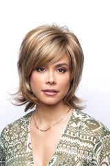 Claire by Noriko by Rene of Paris synthetic wig is a medium length, with flipped out layered wig with a side swept textured bang. Featuring in a lightweight basic cap construction, with wefted sides and back allowing comfort and maximum scalp cooling. Made with a permatease top which is a teasing, short haired, crimping effect on the roots to create more lift and volume.