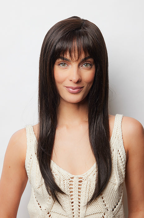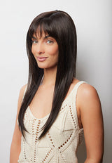 Stevie by Amore part of the Rene of Paris Company is a synthetic wig features long cascading layers with a soft textured full front bang. Featuring a double monofilament top that resembles the most realistic hairline and enables parting versatility and multi-directional styling.