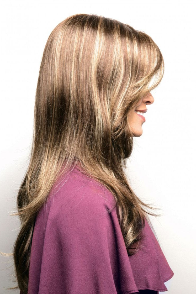 Angelica by Noriko part of the Rene of Paris Company, is a gorgeous long synthetic wig with swept over side bang. Featuring an open weft cap construction allowing for an airy cool design which is lightweight and ideal for everyday wear. Created with a teasing hair effect on the roots providing extra lift on top. Made with a permatease top which is a teasing, short haired, crimping effect on the roots to create more lift and volume.