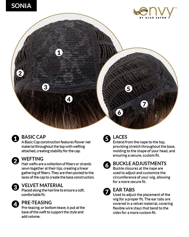 Sonia by Envy is a traditional layered hairstyle featuring side-swept bangs for effortless styling. Its basic cap construction ensures a comfortable and cool fit, making it the perfect choice for all-day wear.