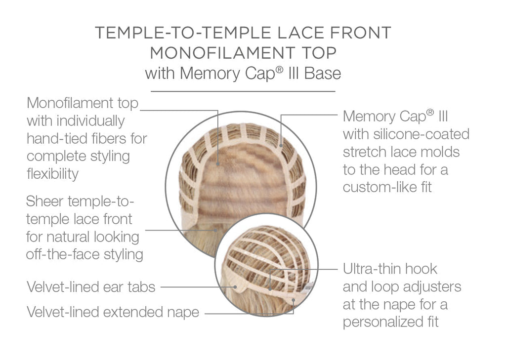 • base design: monofilament top – Creates the illusions of natural hair growth and allows you to part the hair in any direction.