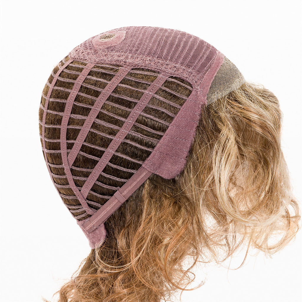 This type of cap features a wonderfully natural crown or “crest” area, where each and every hair has been individually weaved. This area varies on all models, depending on the style, it is usually either pointed or elongated. The wig looks particularly natural in areas where the skin is visible, as the weave of wig hair appears to flow directly from your own scalp, just like natural hair growth. The rest of this wig mostly consists of a wefted cap in which the hair is sewn into fine cotton tapes. Wefted caps adapt very well to the shape of the head and allow air to circulate.