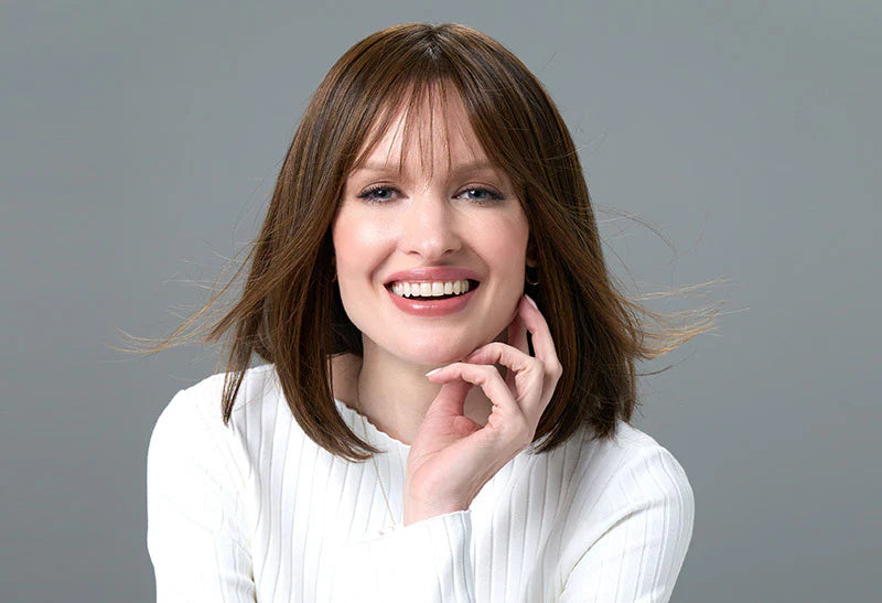 A sleek, medium-length bob with soft bangs and feathered ends. Paige features an extended lace front, monofilament top, and hand-tied cap for a natural look and lightweight comfort. Made with EnvyHair™, our exclusive human hair and heat-friendly fiber blend, Paige gives you endless styling versatility with effortless elegance.