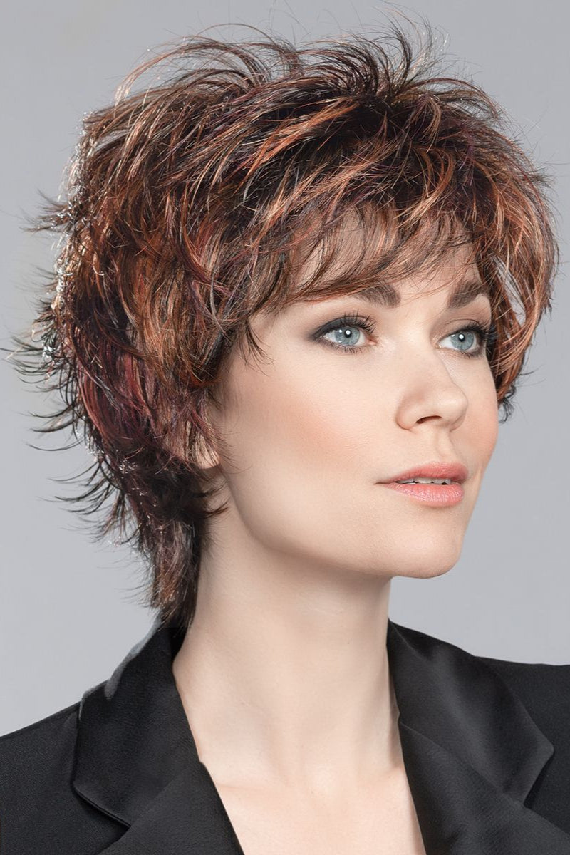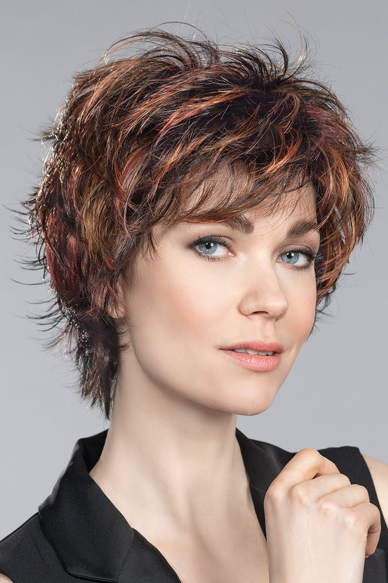 Click by Ellen Wille synthetic wig is a textured flip out short design wig with extreme layering throughout. Featuring in a lightweight basic cap construction, with wefted sides and back allowing comfort and maximum scalp cooling. Made with a permatease top which is a teasing, short haired, crimping effect on the roots to create more lift and volume