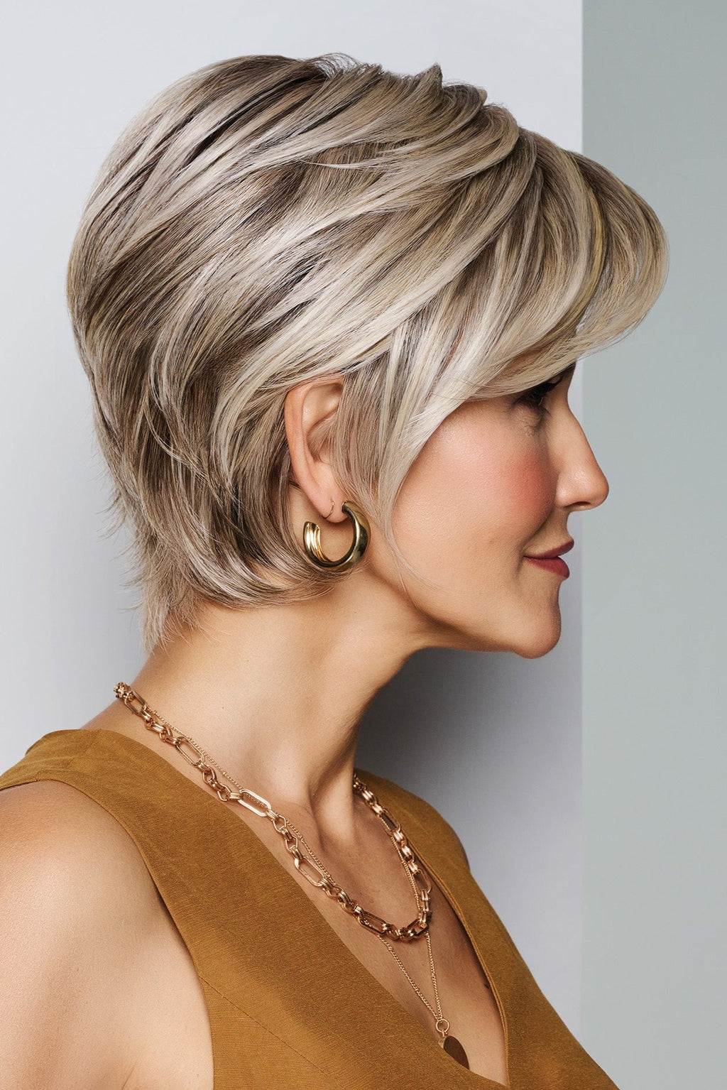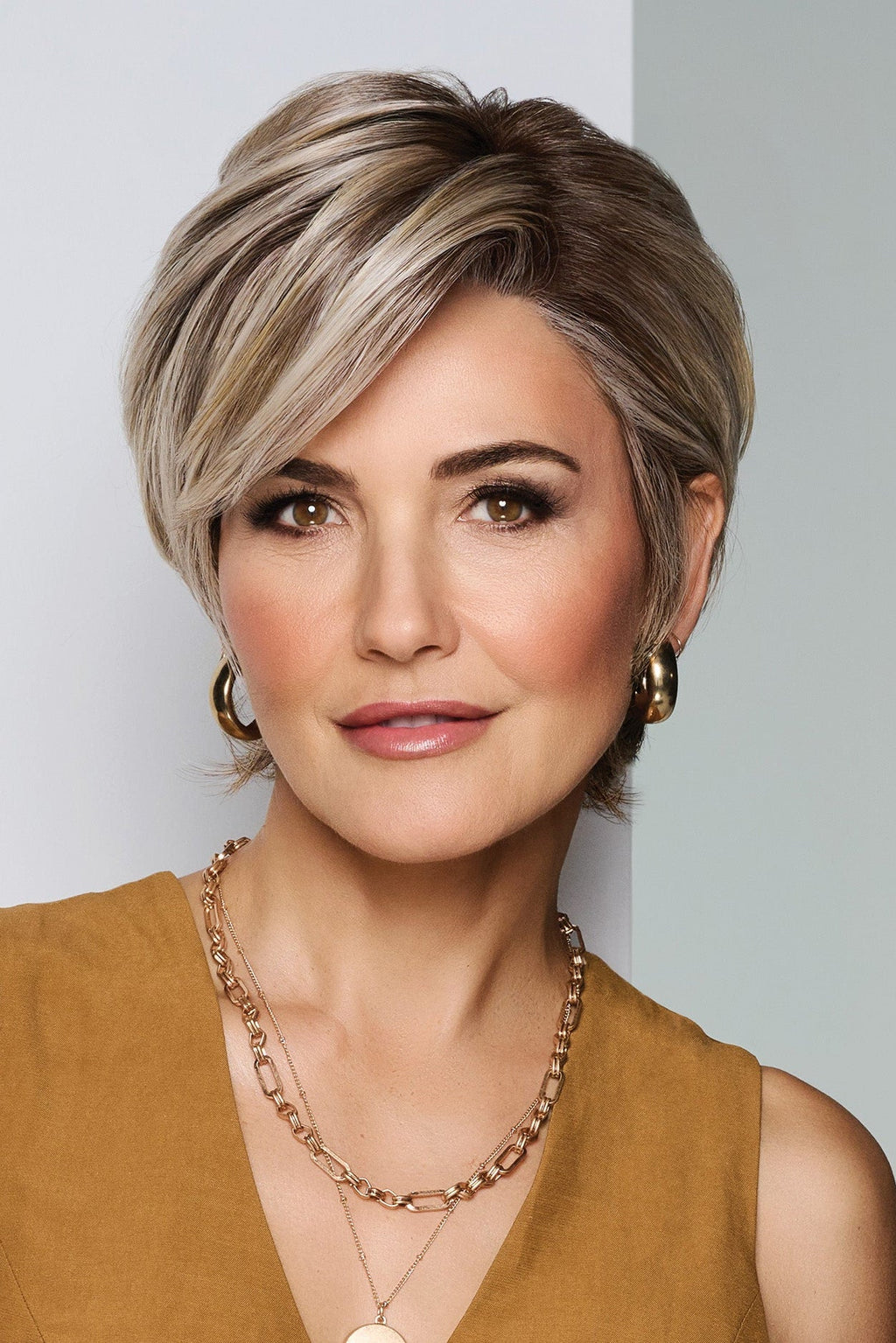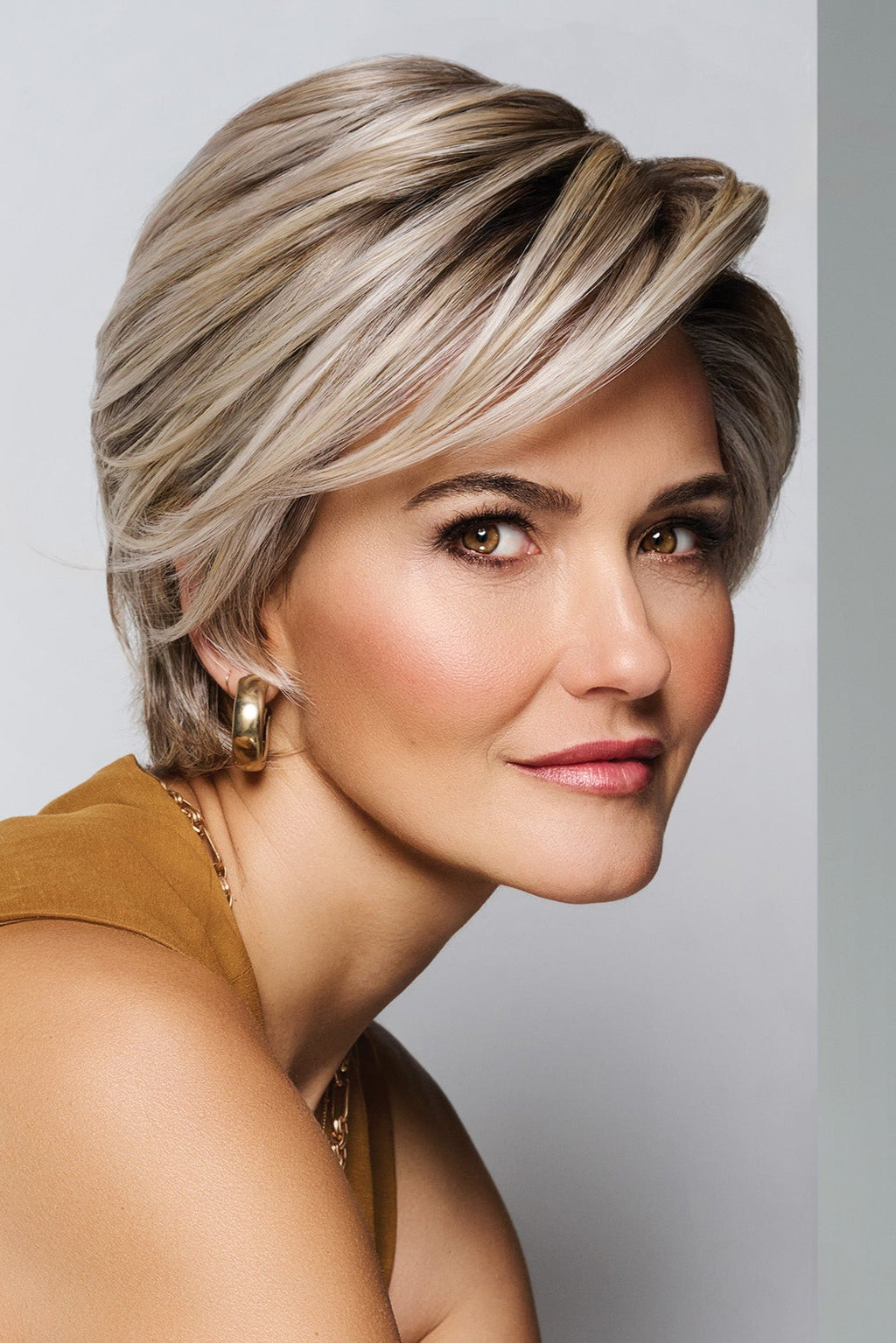 Posh Premiere by Raquel Welch brings effortless sophistication to your everyday style. This chic, short wig features a beautifully layered boycut with soft, face-framing bangs and tapered sides for a refined, polished look. The subtle volume at the crown enhances fullness, creating a natural and flattering silhouette. Made with HairUWear’s exclusive FeatherLite fiber, the synthetic strands have a unique hollow-core design, making them incredibly lightweight—even lighter than human hair. The fibers also retain their shape and can be heat-styled, giving you endless versatility.