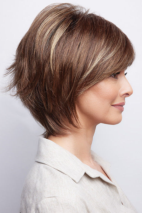 Reese by Noriko part of the Rene of Paris Company, is a gorgeous bouffant, with a swept side bang. Featuring in a lightweight basic cap construction, with wefted sides and back allowing comfort and maximum scalp cooling. Made with a permatease top which is a teasing, short haired, crimping effect on the roots to create more lift and volume.