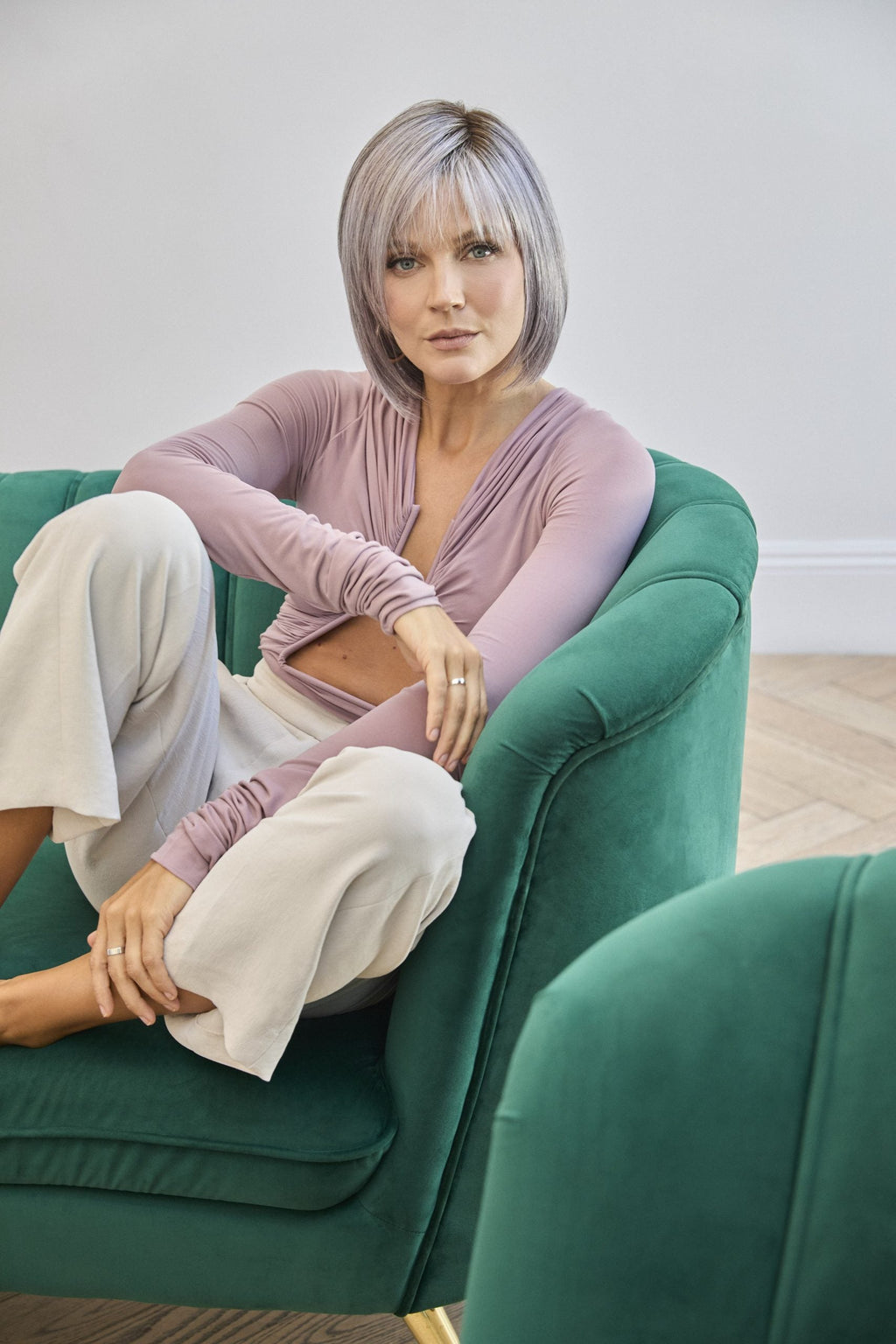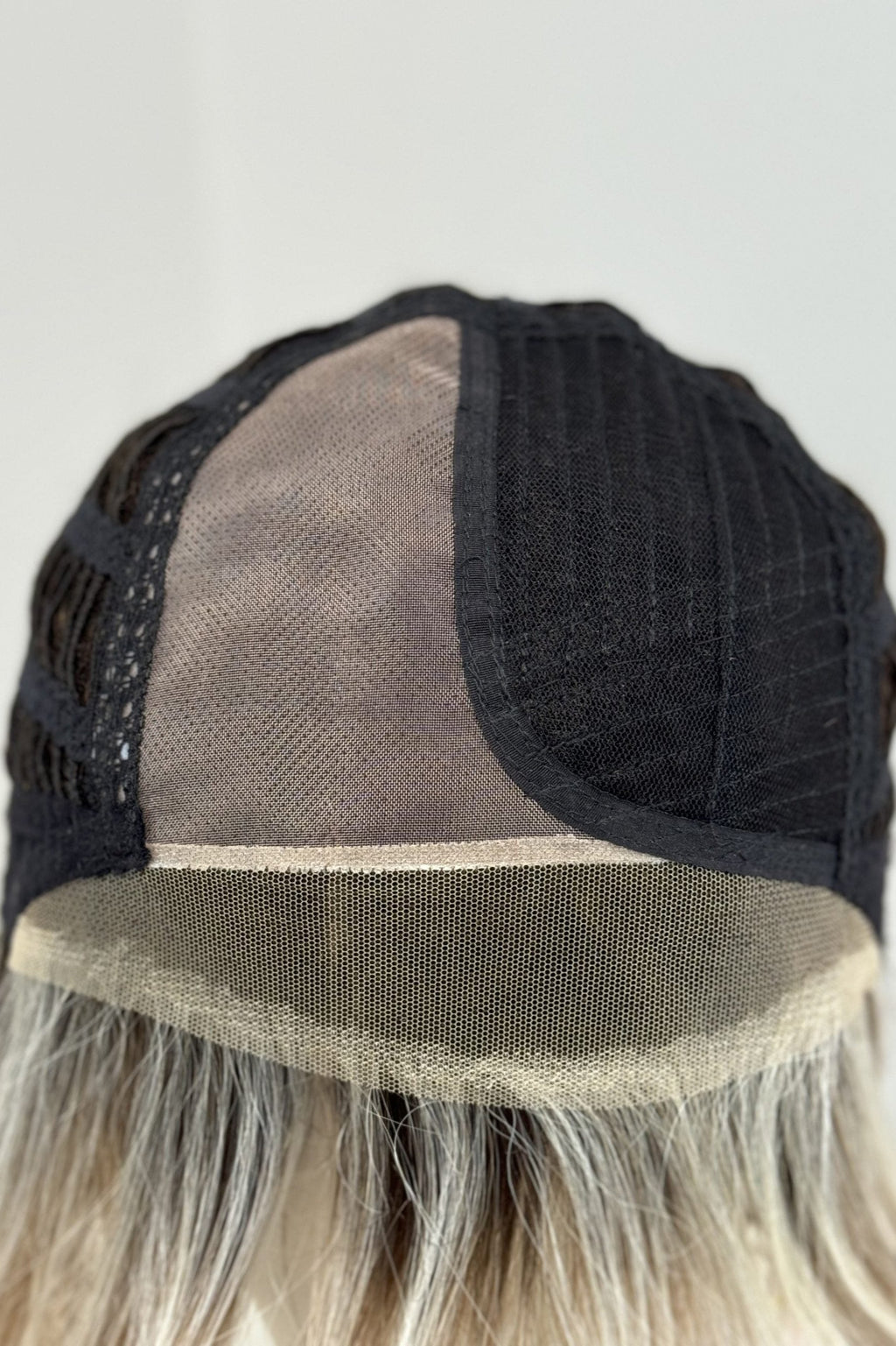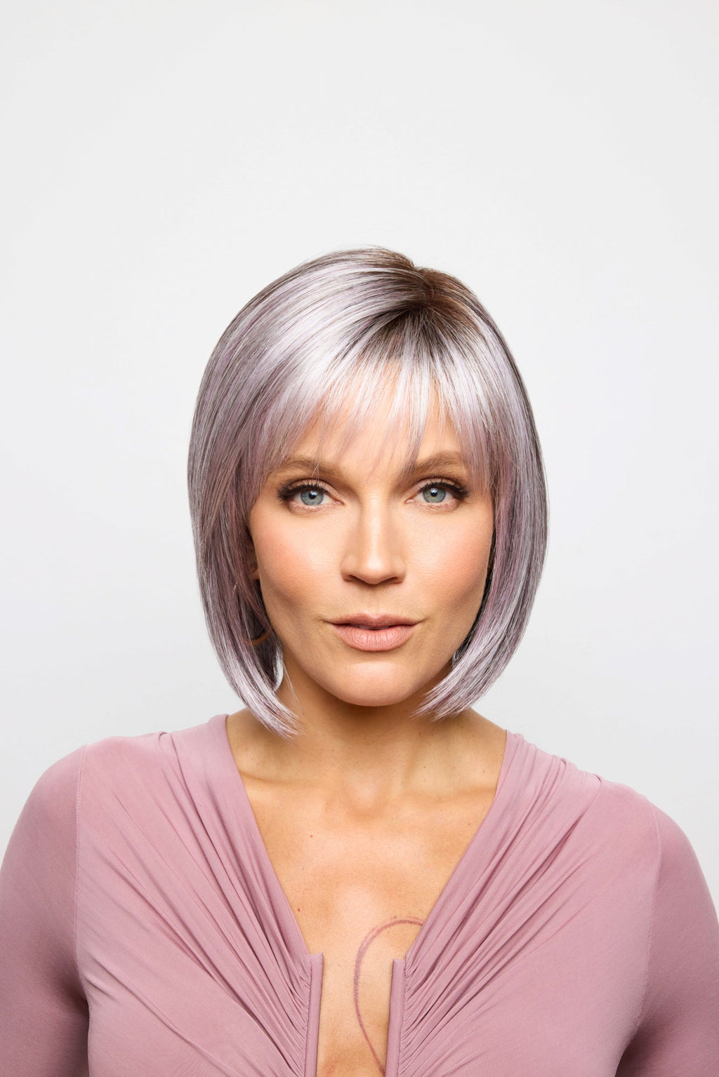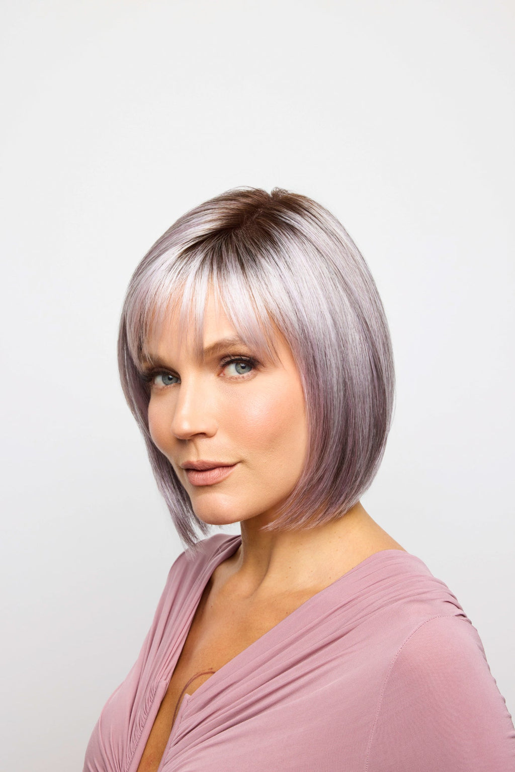 Wynn by Noriko features a short layered bob with bangs and a realistic appearance thanks to its lace front and monofilament part. The fit can also be customized with adjustable tabs at the back nape area.