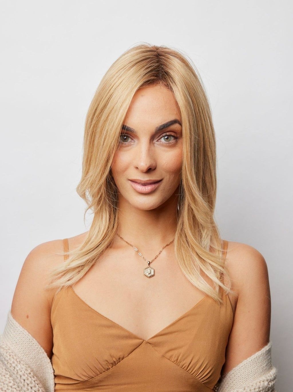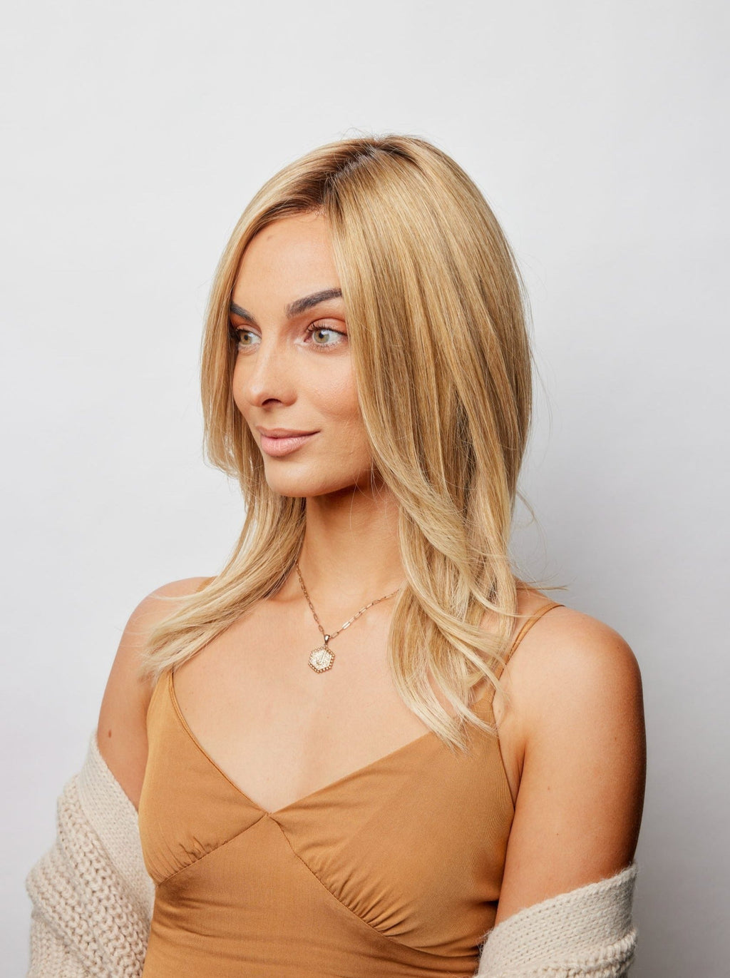 Experience the ultimate comfort and style with Thea, a beautiful medium length Remy human hair wig from the Amore Collection. Its delicate lace front and monofilament top are complemented by silicone strips for maximum comfort. The hand-tied cap is meticulously crafted, ensuring a lightweight and comfortable fit.