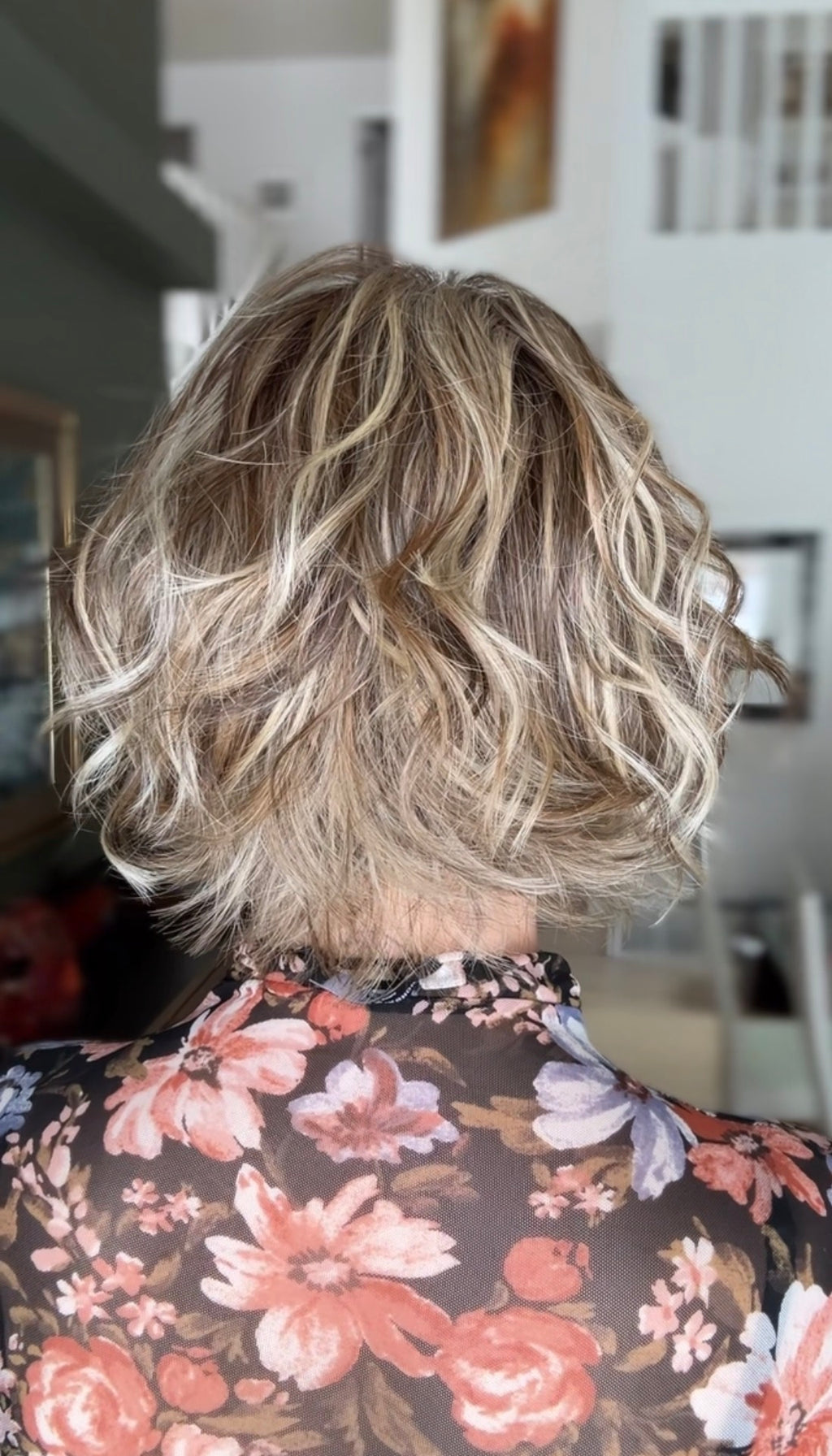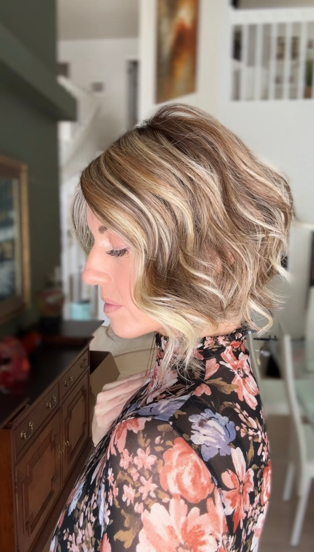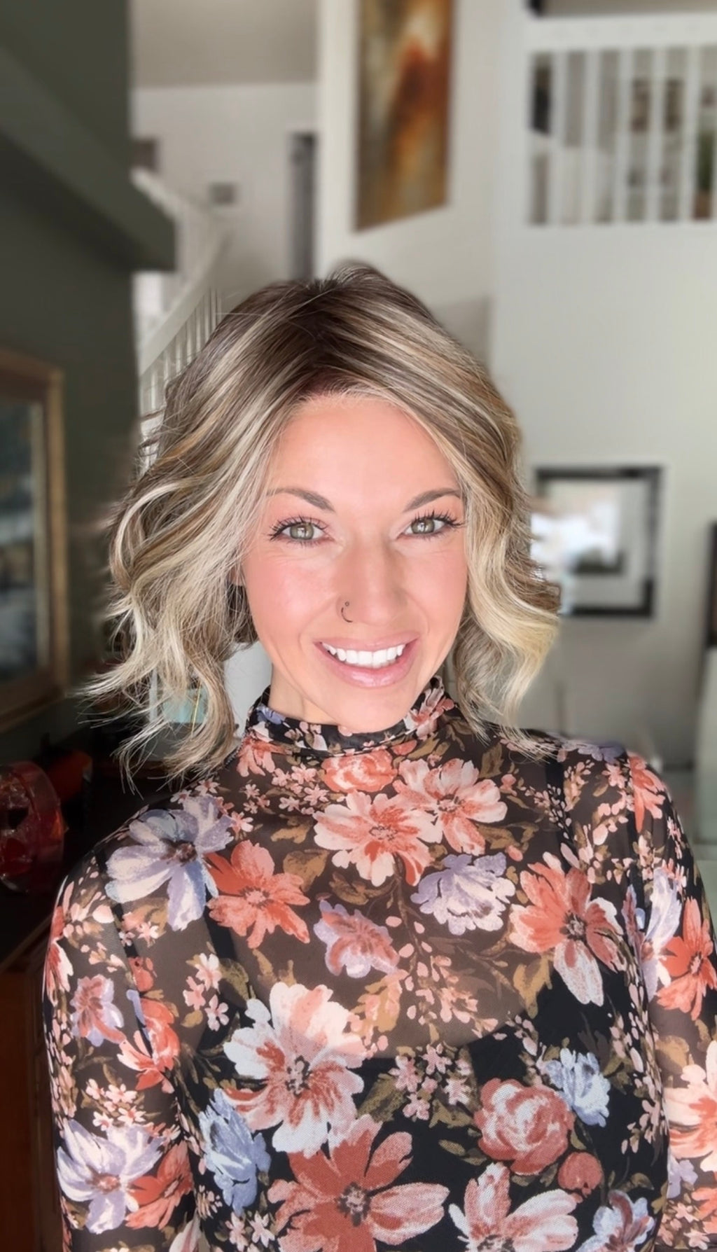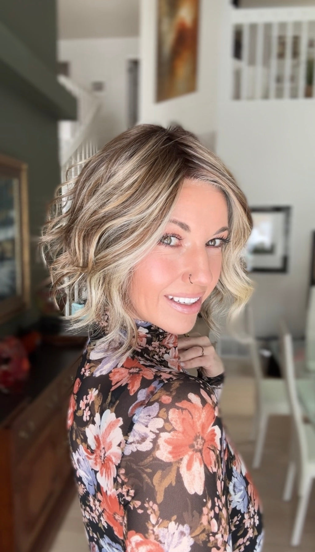 This modern, chin-length bob features soft, tousled waves that create natural movement and effortless volume. Light layering throughout gives the style an airy feel while maintaining a flattering shape that frames the face beautifully. The wave pattern is relaxed and versatile, making it easy to wear polished or slightly undone for a more casual look.