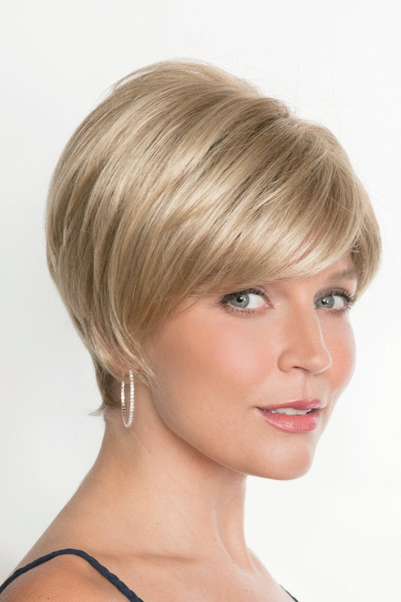 Megan by Noriko is a synthetic wig set in a short designed bob style wig with tapered back and textured longer layered swept side bang. Megan features a basic cap construction with wefted back and side for the most cool comfortable fit. Made with a permatease top which is a teasing, short haired, crimping effect on the roots to create more lift and volume.