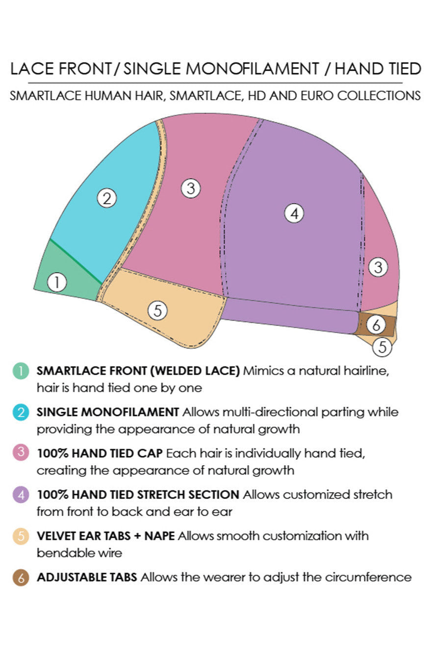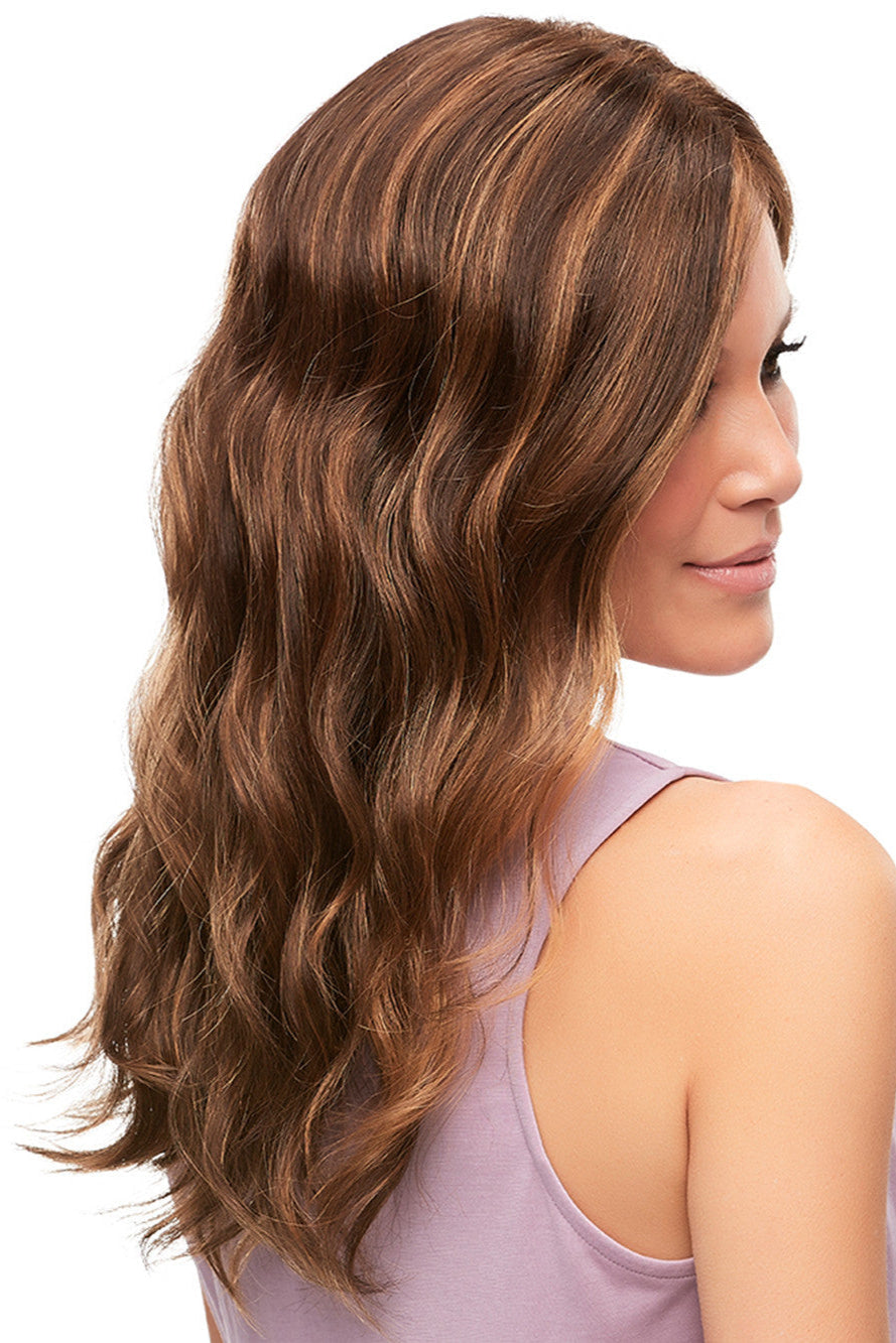 Sarah Large by Jon Renau features a long wavy textured design. Sarahs base construction consist of detailed a 100% hand-tied cap where each and every hair has been individually weaved, an invisible lace front which blends naturally against your hairline for off the face styling and a monofilament top that resembles the most realistic hairline and enables parting versatility and multi-directional styling.