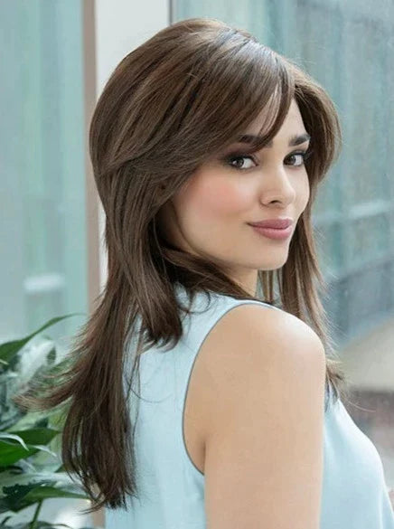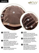 CELESTE by ENVY is a long, layered face-framing bombshell available in 25 fashion-forward colorations. Its individually Hand-Tied, Mono Top construction provides natural movement and the flexibility to comb its side-swept bangs back or towards the face.