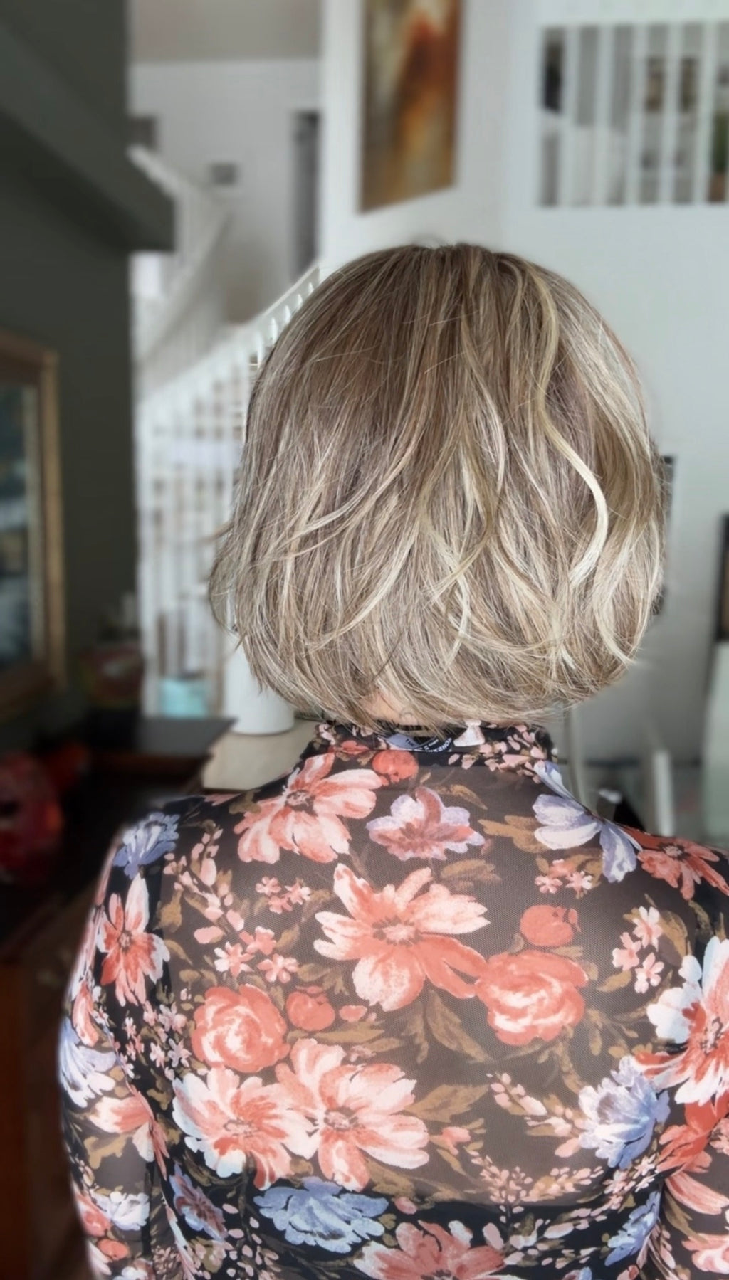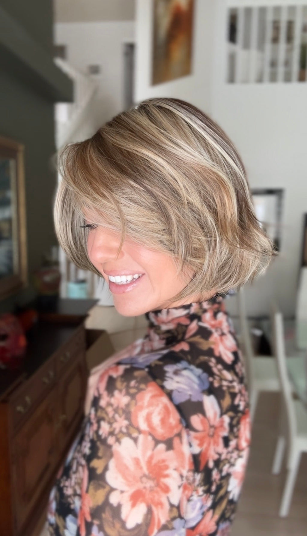 This polished bob features a softly sculpted shape that sits at jaw to chin length, offering a flattering and timeless silhouette. Light layering throughout creates natural volume and movement while maintaining a smooth, balanced profile from every angle. The ends are delicately textured, allowing the style to fall effortlessly and avoid a blunt or heavy finish.