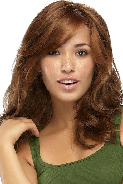 Gisele by Jon Renau is a cascade of curls falling mid back with a soft sweeping side bang. Featuring in a monofilament top that resembles the most realistic hairline and enables parting versatility and multi-directional styling and an invisible lace front which blends naturally against your hairline for off the face styling.