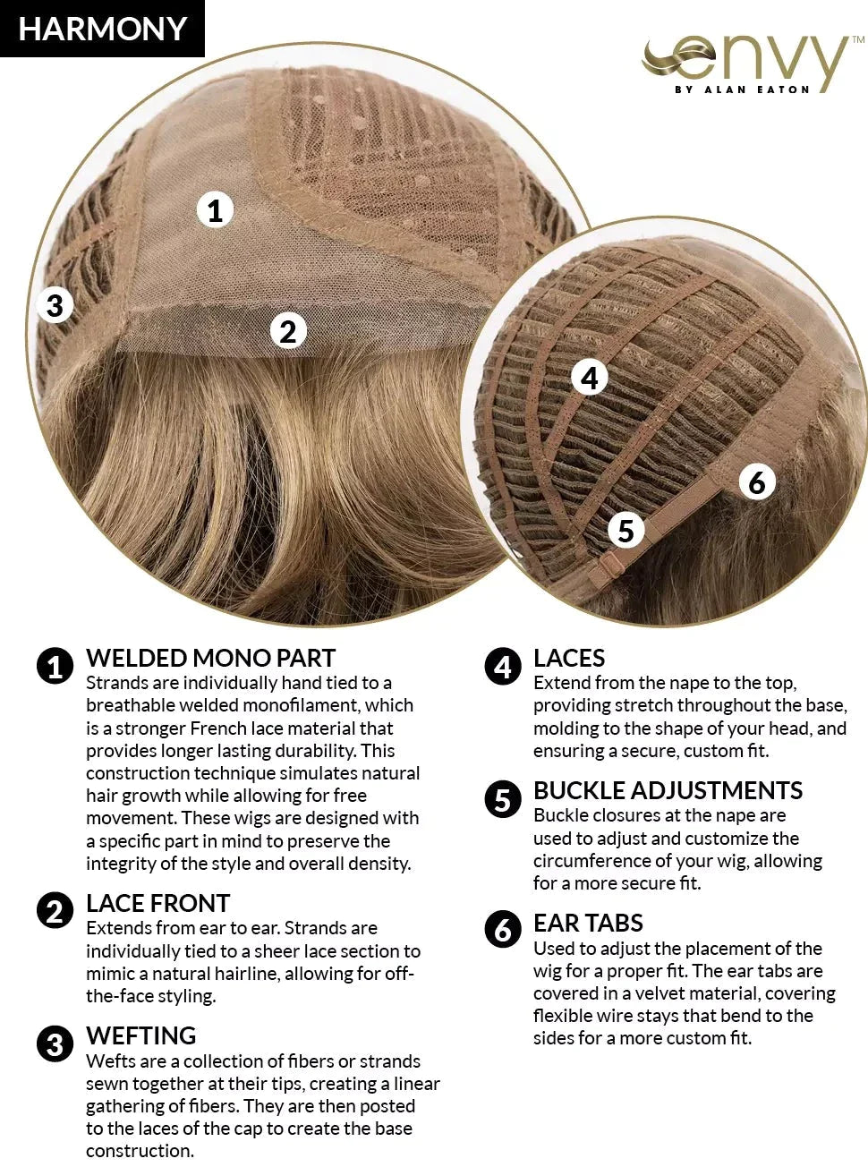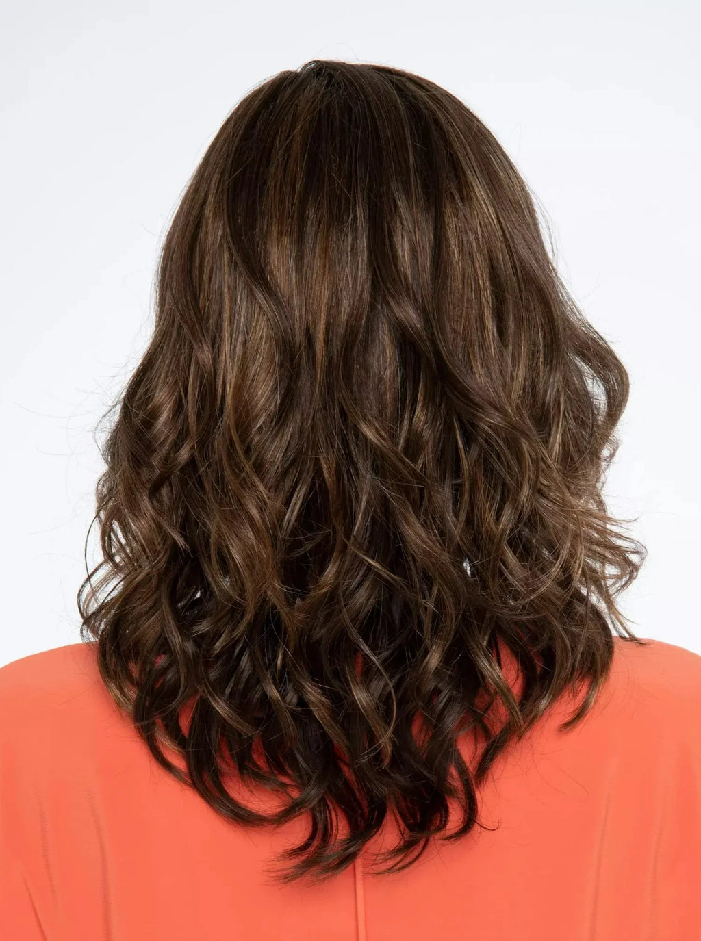 Harmony by Envy features a lace front and monofilament part for a natural-looking wavy cut. Its length allows for versatile styling options, such as pinning the wispy bangs and front flowing waves for a unique look.