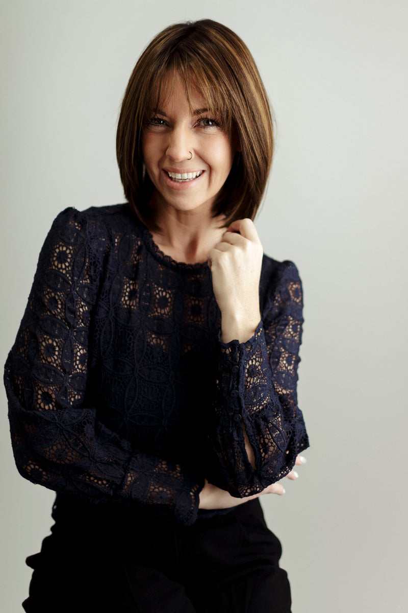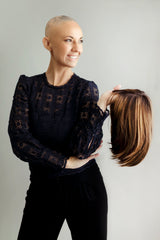 Jody is a mid-length, feathery bob with soft bangs that create a light, airy look. The open wefted cap provides breathability and comfort, while the full monofilament top ensures a natural appearance and allows for versatile parting. The extended temple-to-temple lace front offers a seamless, realistic hairline, ideal for styling off the face. Designed with velvet ear tabs and a velvet nape with a removable silicone strip, it ensures a secure and comfortable fit, with velcro adjusters for easy customization. Made from heat friendly synthetic fiber, Jody has a lightweight feel and no permatease, delivering a smooth and natural look. The soft, feathery layers and bangs frame the face beautifully, making it a stylish and versatile choice.