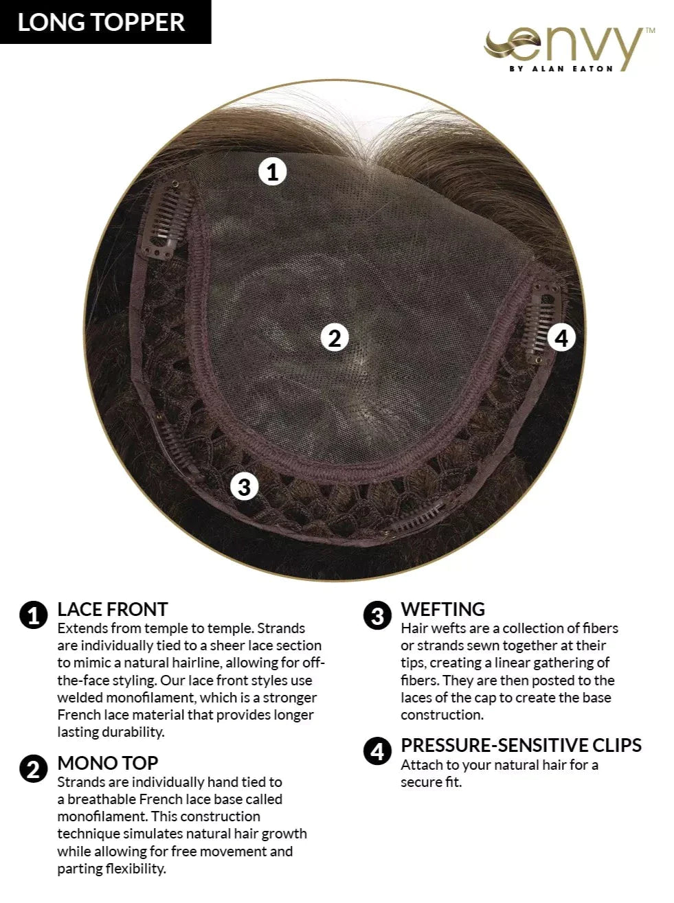 Constructed to better mimic real hair, ENVY’s luxurious Long Topper is sure to give any woman an instant boost—and the confidence to toss or tousle her “new hair.” Featuring our Mono Top construction for supremely natural movement—and available in 15 multi-dimensional shades—our Long Topper adds lush volume and coverage where extensions can’t reach.
