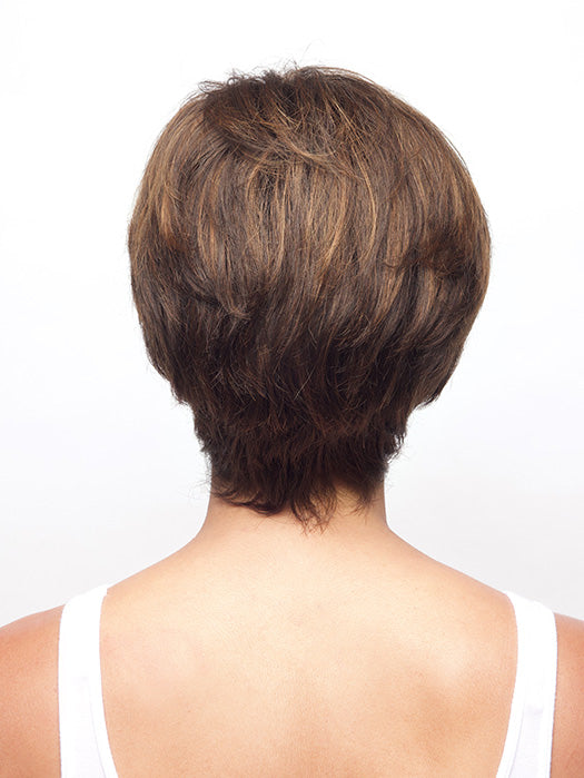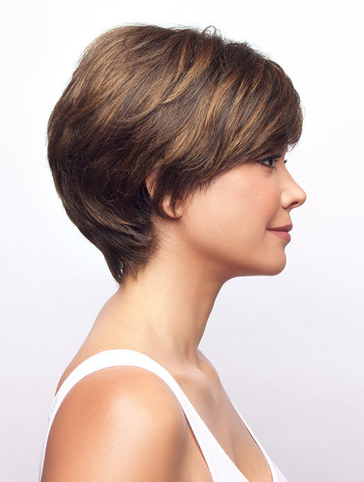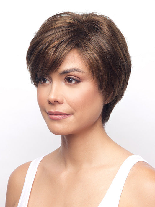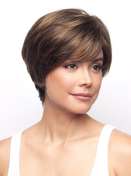 Megan by Noriko is a synthetic wig set in a short designed bob style wig with tapered back and textured longer layered swept side bang. Megan features a basic cap construction with wefted back and side for the most cool comfortable fit. Made with a permatease top which is a teasing, short haired, crimping effect on the roots to create more lift and volume.