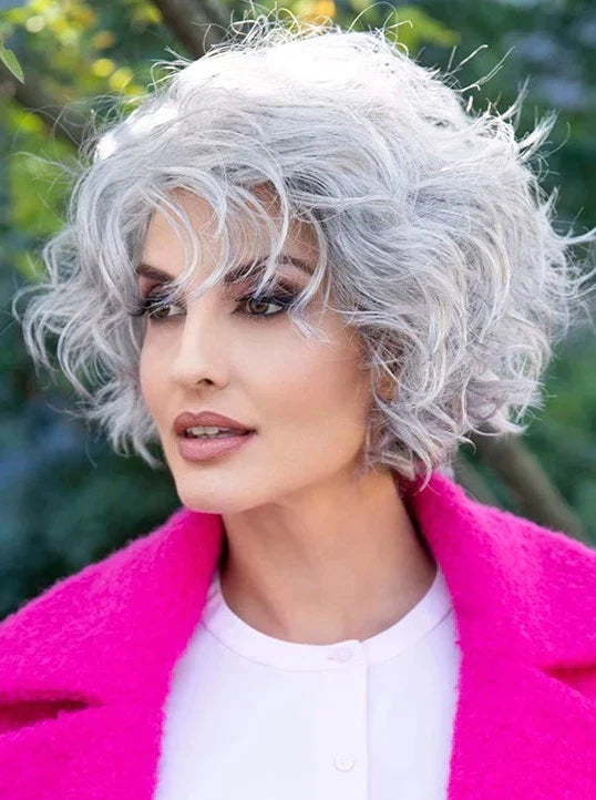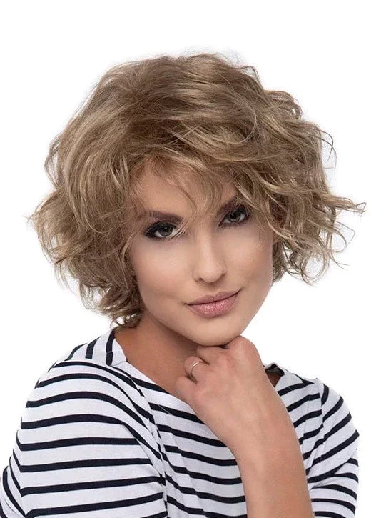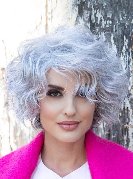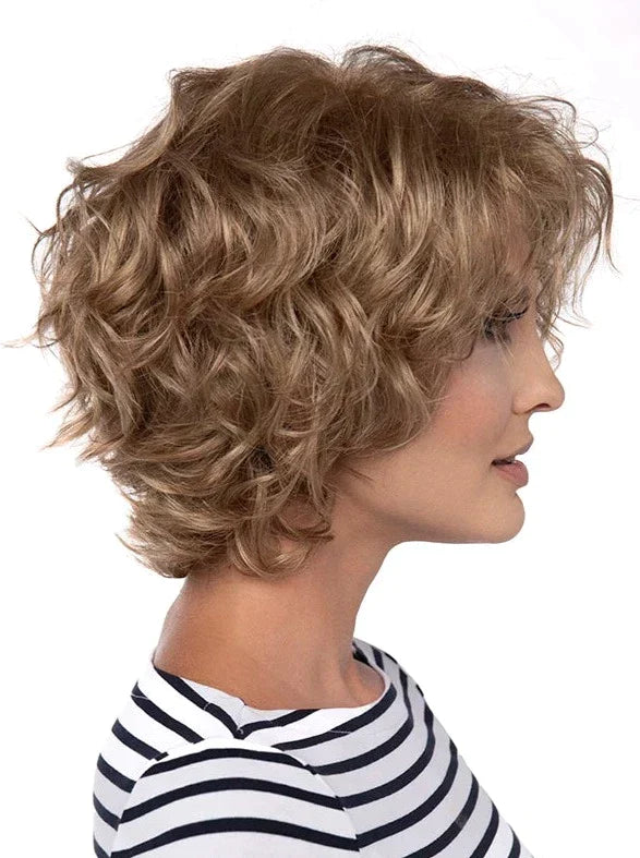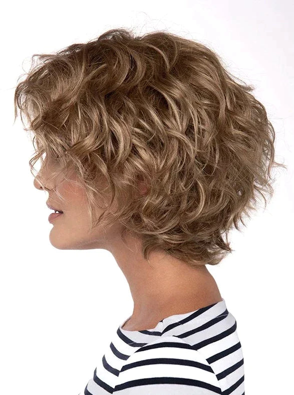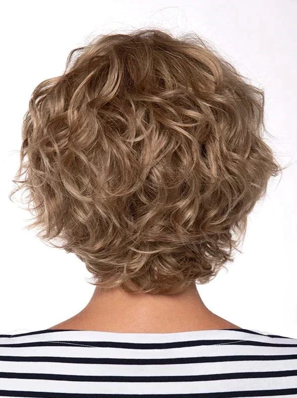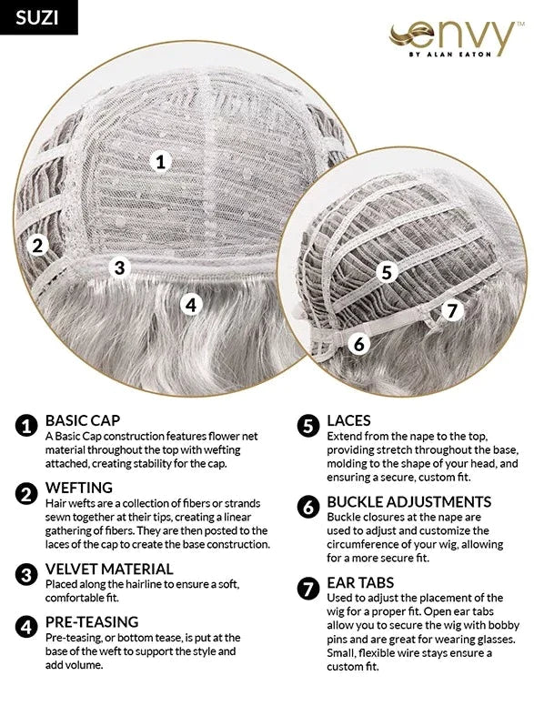 Suzi by Envy includes piece-y bangs that integrate smoothly with face-framing layers. The slightly stacked design and expertly unkempt texture enhance Suzi's curls. This style is effortless to wear due to the open-top construction.