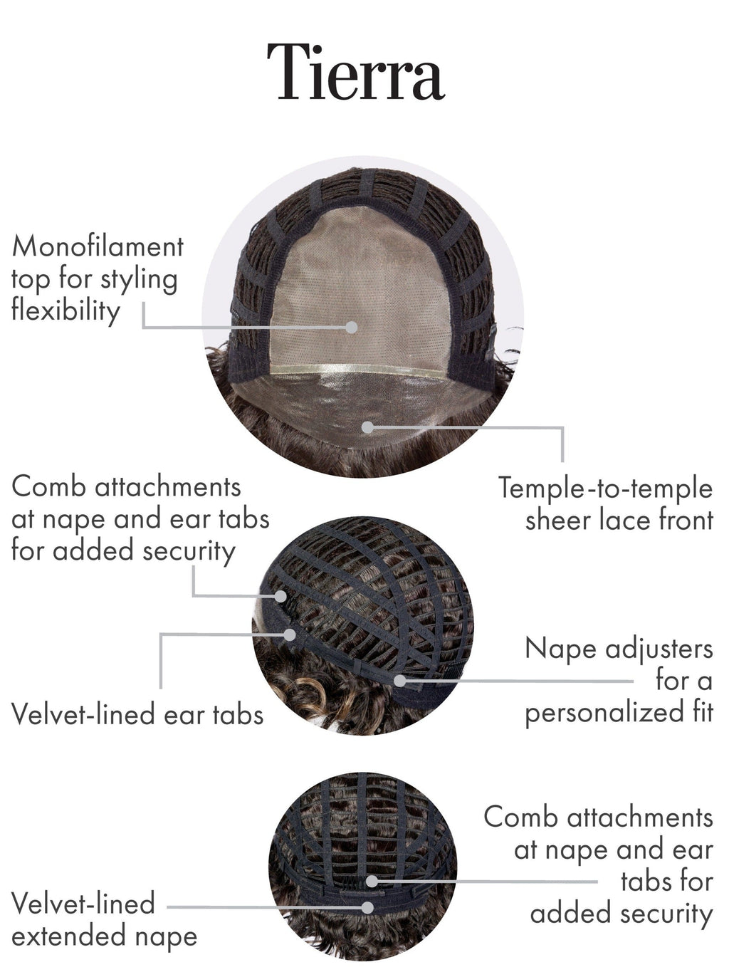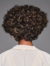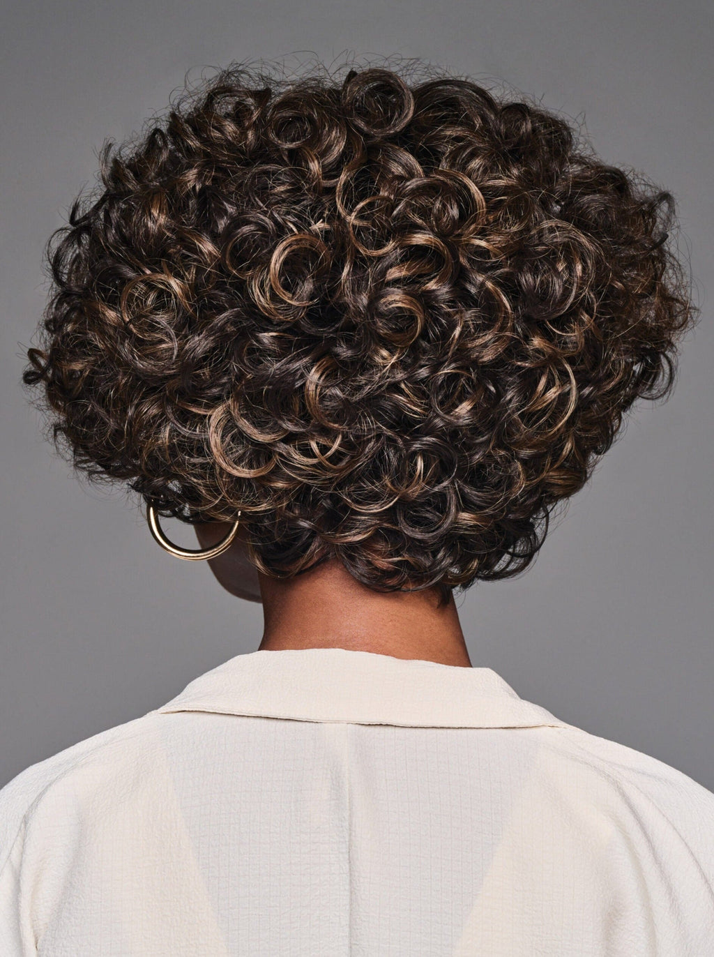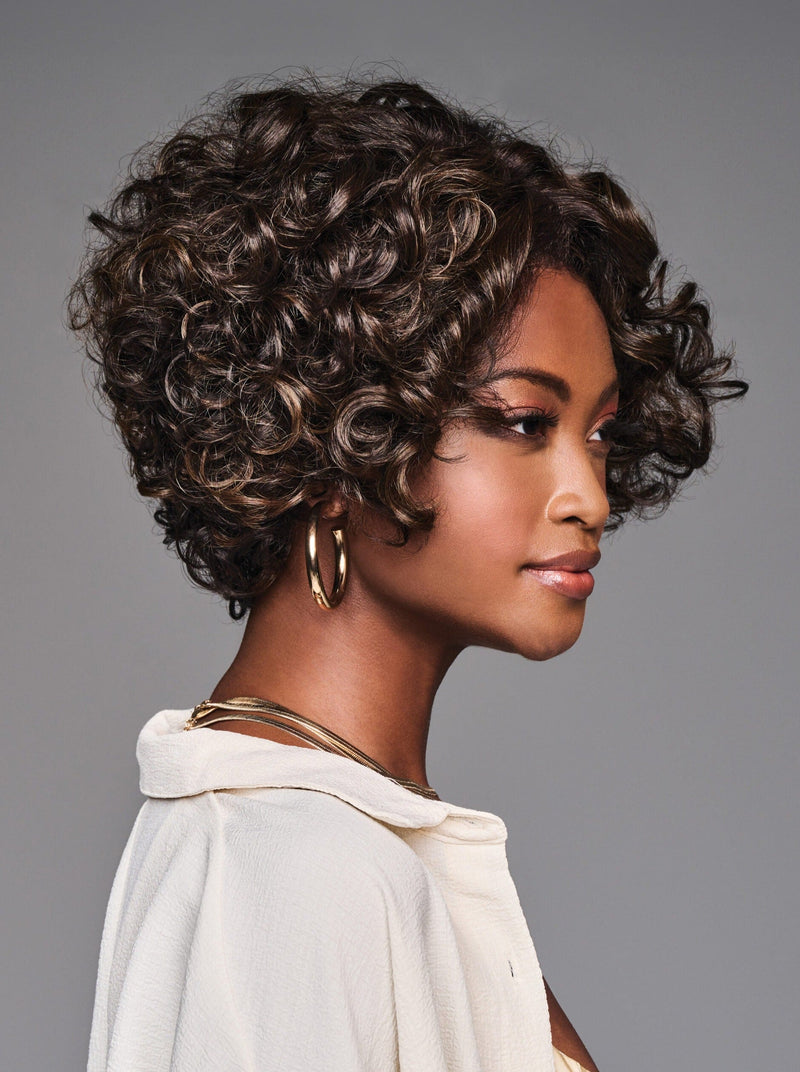 Voluminous spiral curls cropped in a unique shape makes Tierra the kind of charismatic, center-of-attention style destined to be your new signature look. Stacked fullness at crown and sides tapers at the nape creating a chic V-shape that’s weighted above the ears.